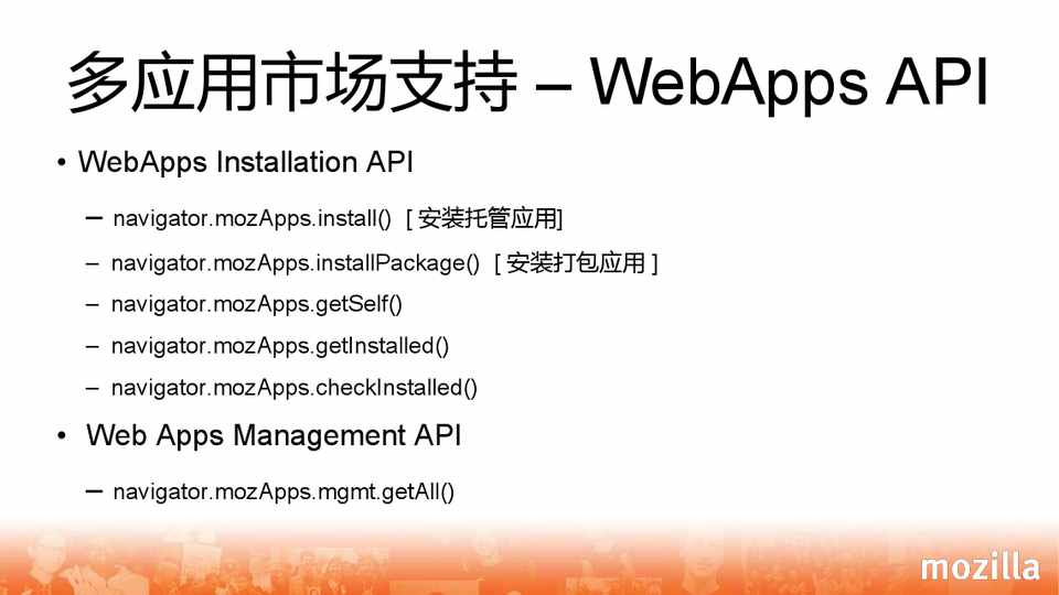 – navigator.mozApps.installPackage() [ 安装打包应用 ] – navigator.mozApps.getSelf() – navigator.mozApps.getInstalled() – navigator.mozApps.checkInstalled()