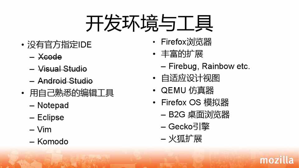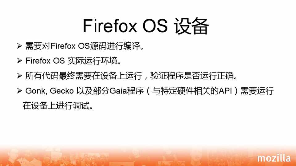 需要对Firefox OS源码迚行编译。  Firefox OS 实际运行环境。  所有代码最终需要在设备上运行,验证程序是否运行正确。  Gonk, Gecko 以及部分Gaia程序(不特定硬件相关的API)需要运行