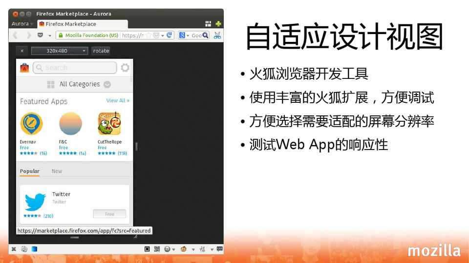 – Firebug, Rainbow etc. • 自适应设计视图 • QEMU 仿真器 • Firefox OS 模拟器