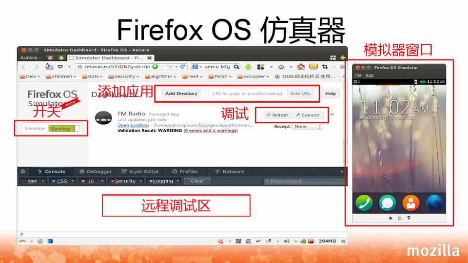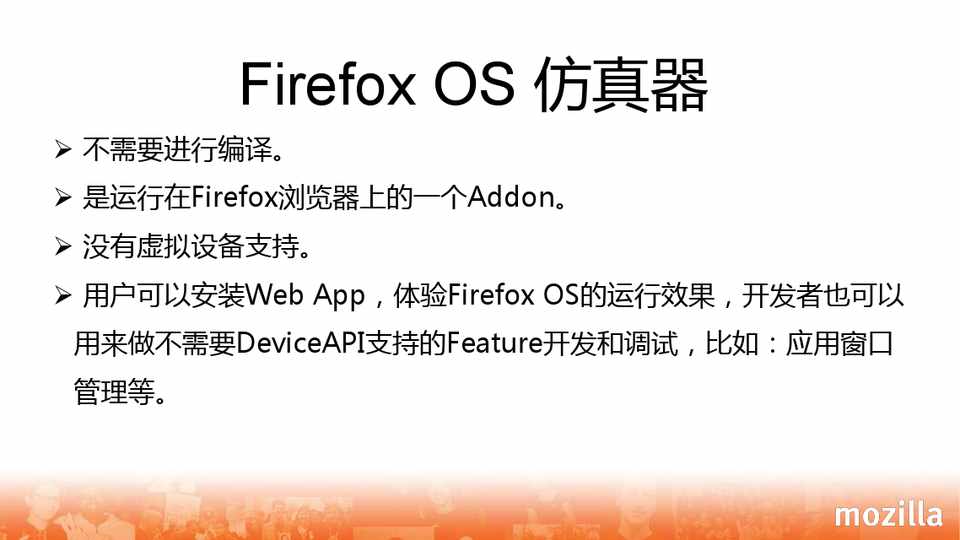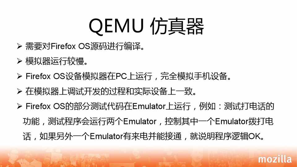 需要对Firefox OS源码迚行编译。  模拟器运行较慢。  Firefox OS设备模拟器在PC上运行,完全模拟手机设备。  在模拟器上调试开发的过程和实际设备上一致。  Firefox OS的部分测试代码在Emulator上运行,例如:测试打电话的