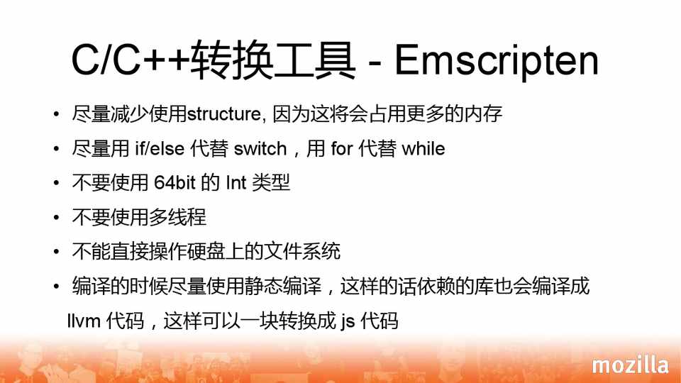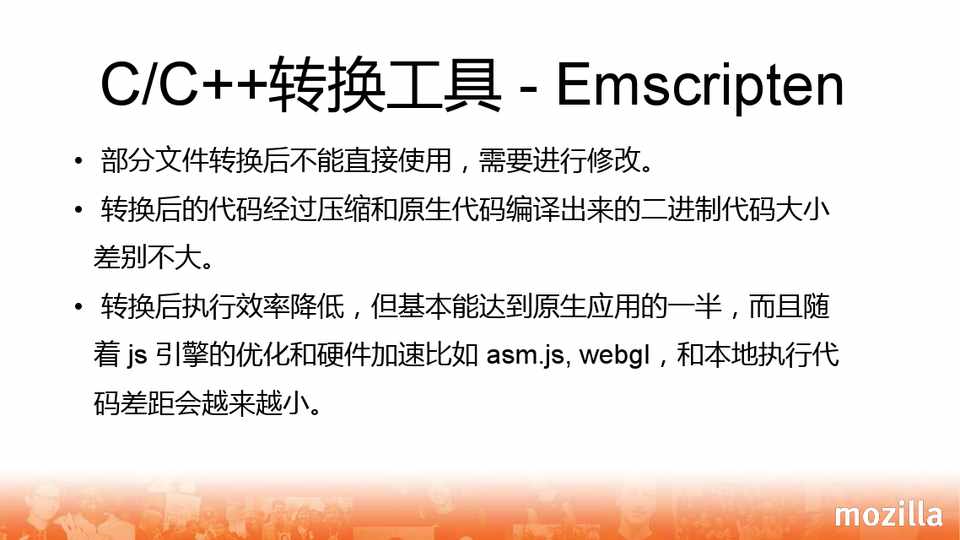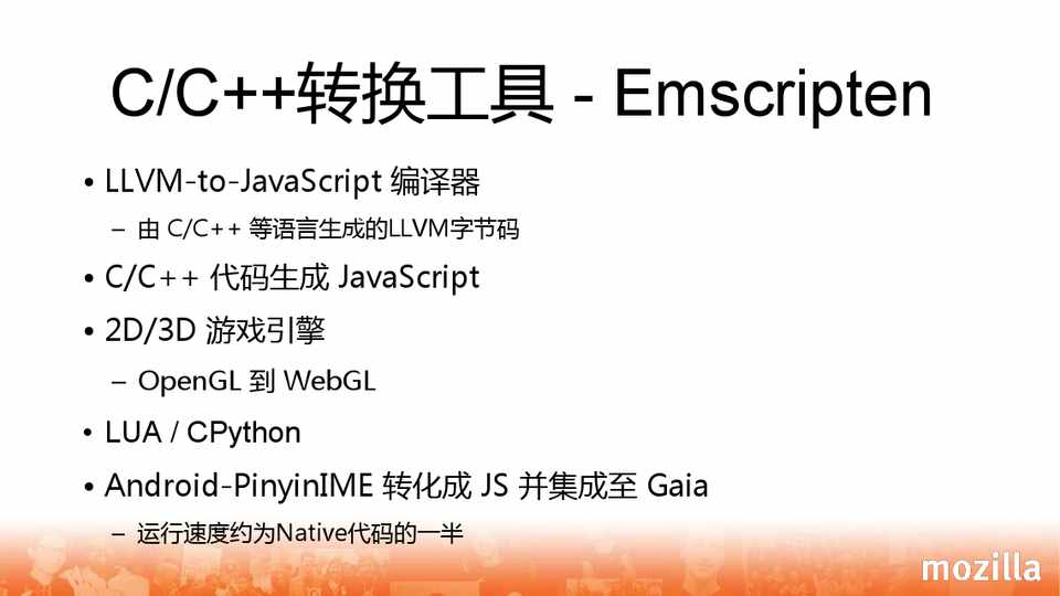 • C/C++ 代码生成 JavaScript • 2D/3D 游戏引擎