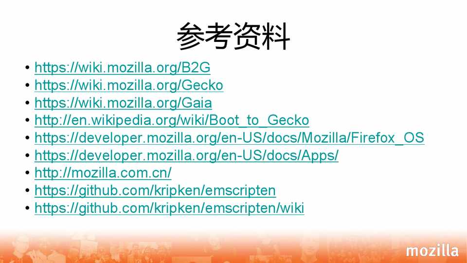 • https://wiki.mozilla.org/B2G • https://wiki.mozilla.org/Gecko • https://wiki.mozilla.org/Gaia • http://en.wikipedia.org/wiki/Boot_to_Gecko • https://developer.mozilla.org/en-US/docs/Mozilla/Firefox_OS • https://developer.mozilla.org/en-US/docs/Apps/ • http://mozilla.com.cn/ • https://github.com/kripken/emscripten • https://github.com/kripken/emscripten/wiki