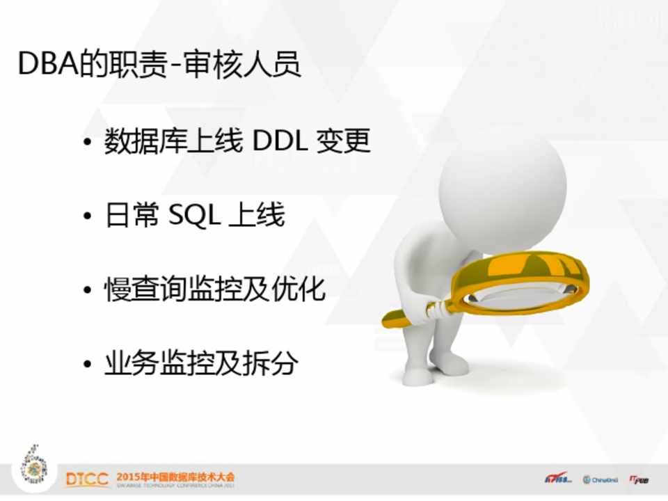 • 数据库上线 DDL 变更 • 日常 SQL 上线 • 慢查询监控及优化 • 业务监控及拆分