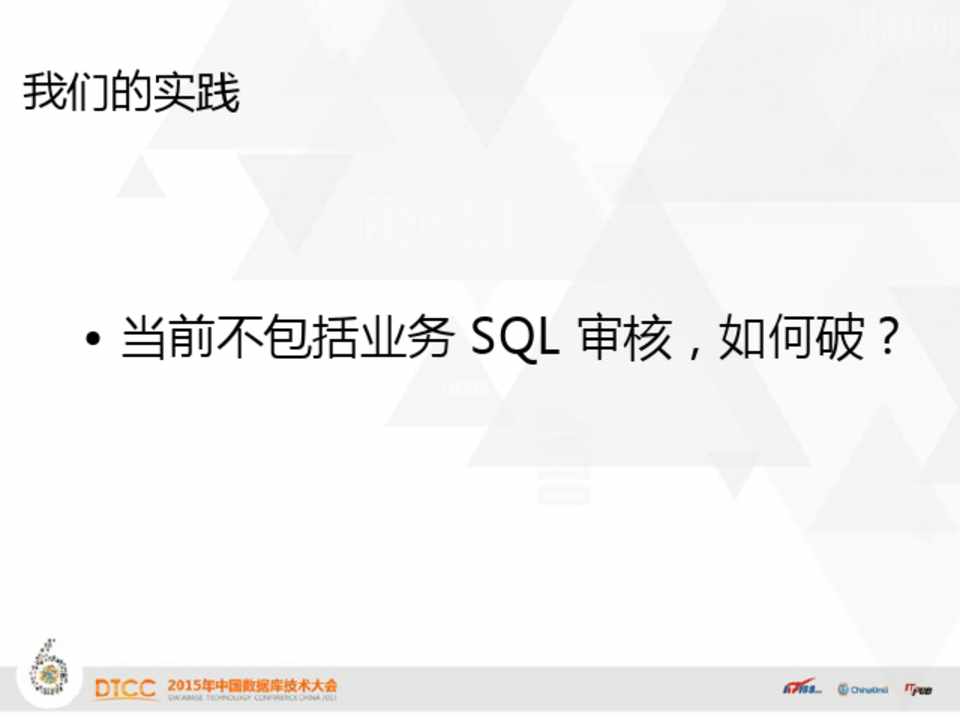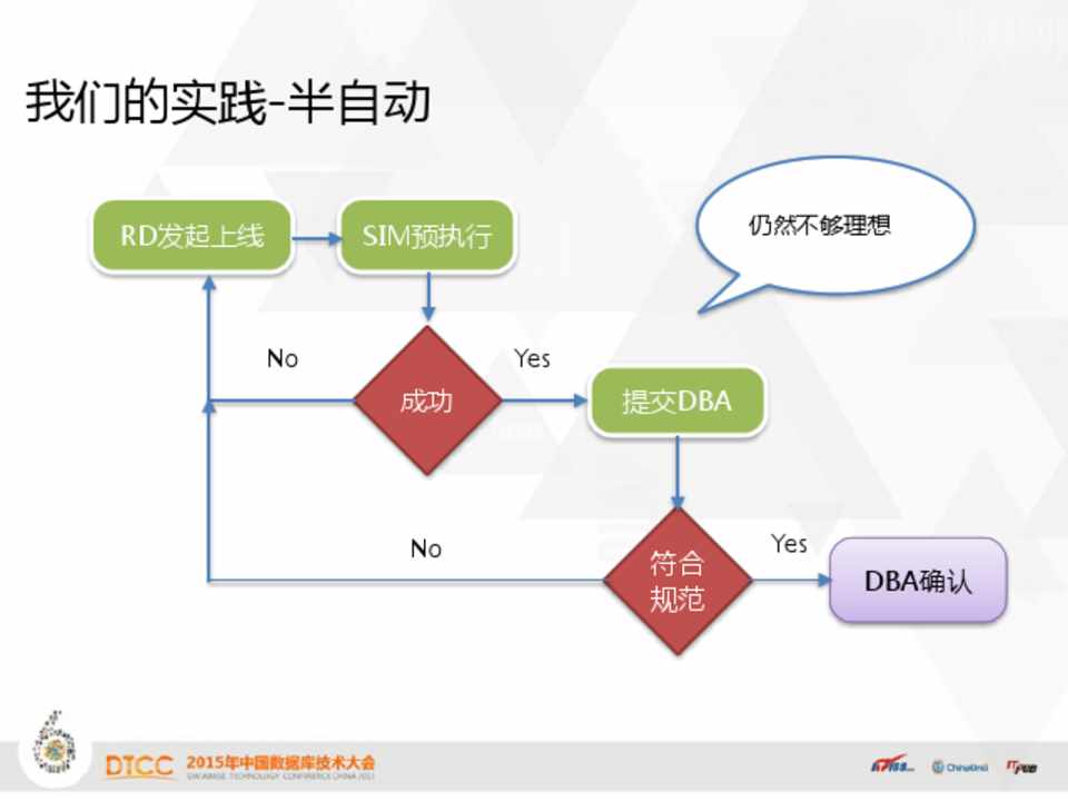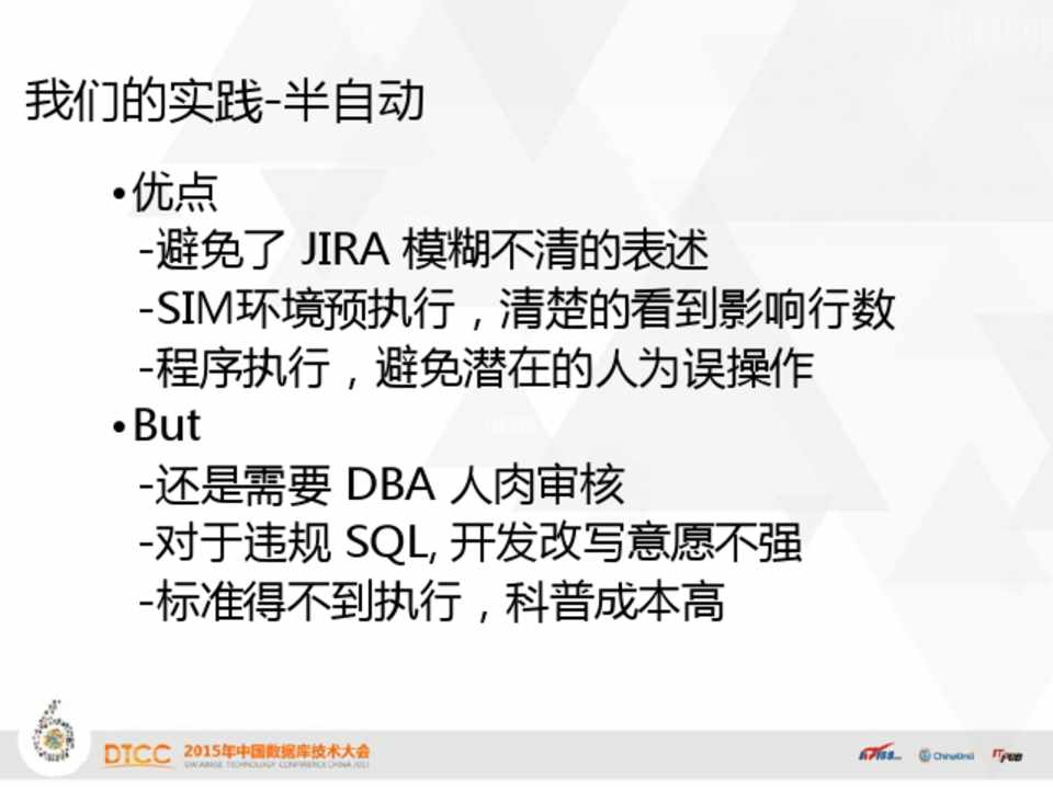 •But -还是需要 DBA 人肉审核 -对于违规 SQL, 开发改写意愿不强 -标准得不到执行,科普成本高