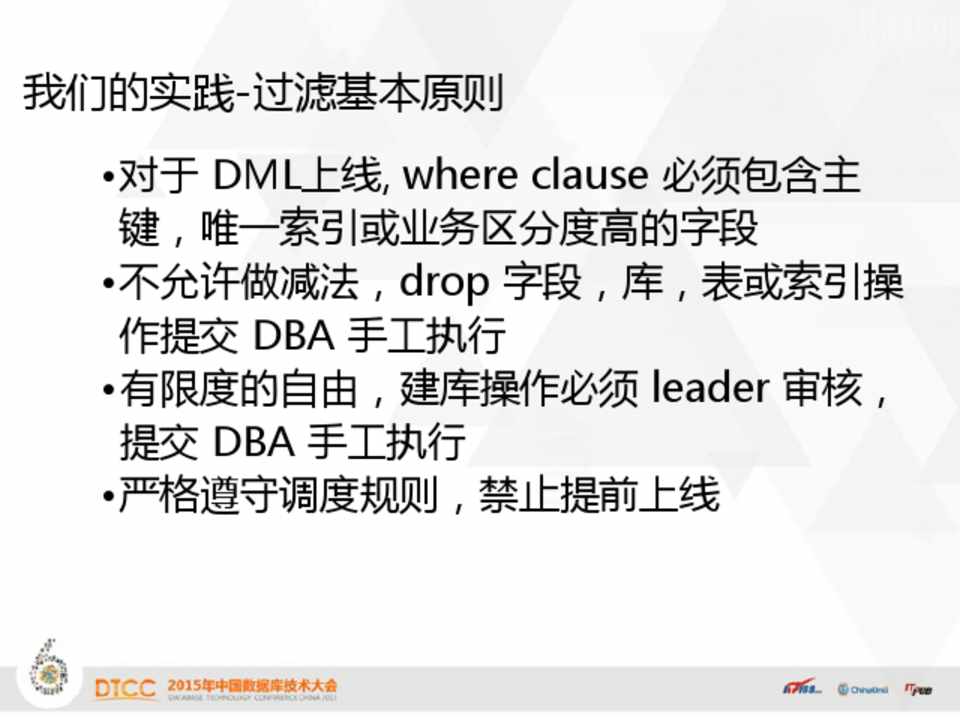 •对于 DML上线, where clause 必须包含主 键,唯一索引或业务区分度高的字段 •不允许做减法,drop 字段,库,表或索引操 作提交 DBA 手工执行 •有限度的自由,建库操作必须 leader 审核, 提交 DBA 手工执行 •严格遵守调度规则,禁止提前上线