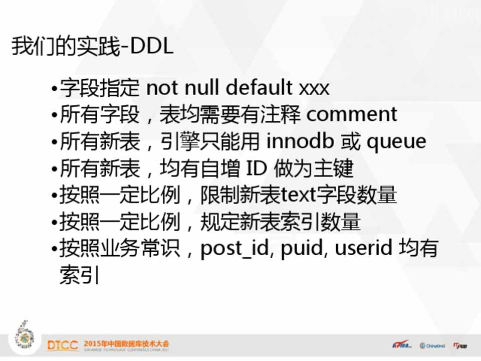 •字段指定 not null default xxx •所有字段,表均需要有注释 comment •所有新表,引擎只能用 innodb 或 queue •所有新表,均有自增 ID 做为主键 •按照一定比例,限制新表text字段数量 •按照一定比例,规定新表索引数量 •按照业务常识,post_id, puid, userid 均有 索引