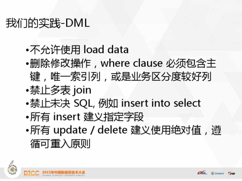 •不允许使用 load data •删除修改操作,where clause 必须包含主 键,唯一索引列,或是业务区分度较好列 •禁止多表 join •禁止未决 SQL, 例如 insert into select •所有 insert 建义指定字段 •所有 update / delete 建义使用绝对值,遵 循可重入原则