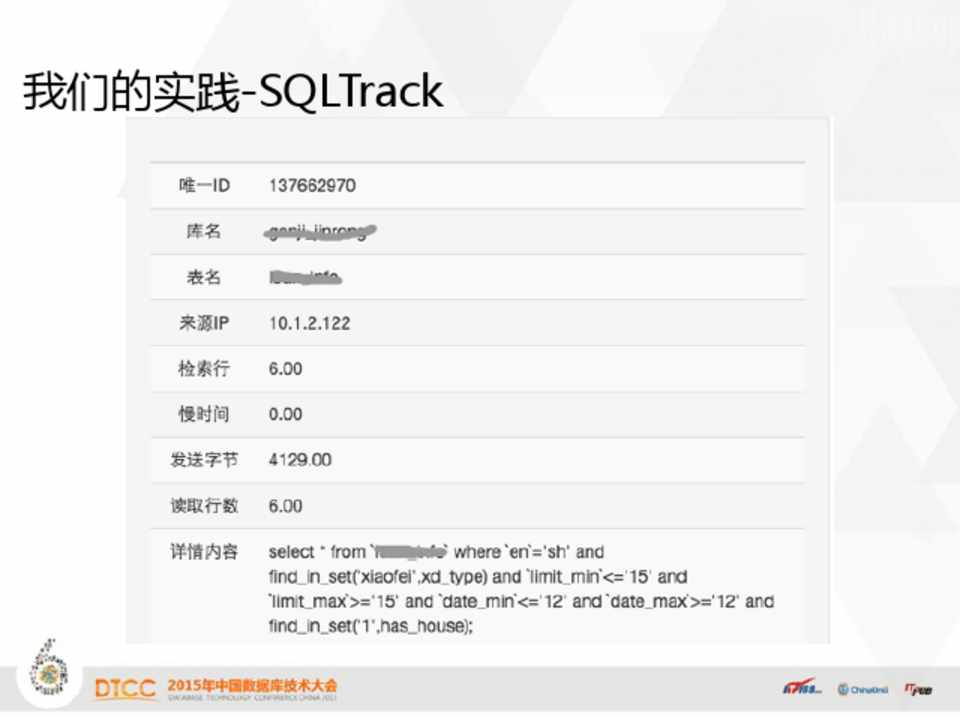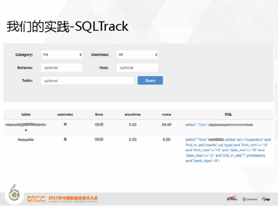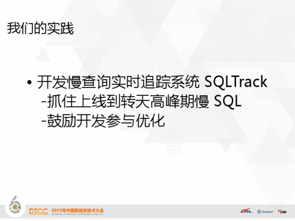 • 开发慢查询实时追踪系统 SQLTrack -抓住上线到转天高峰期慢 SQL -鼓励开发参与优化