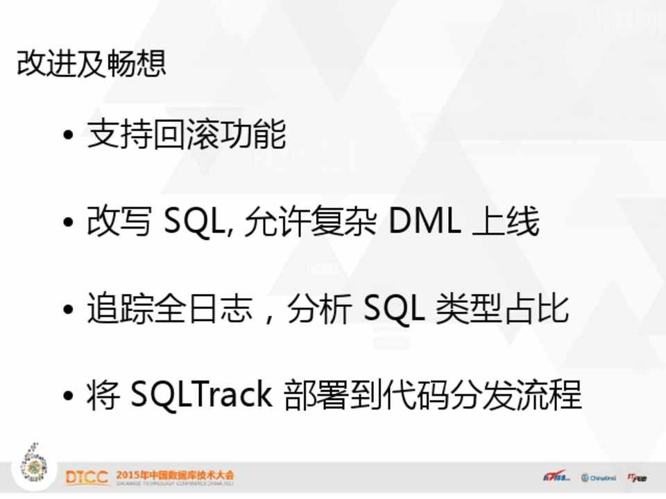 • 支持回滚功能 • 改写 SQL, 允许复杂 DML 上线 • 追踪全日志,分析 SQL 类型占比 • 将 SQLTrack 部署到代码分发流程