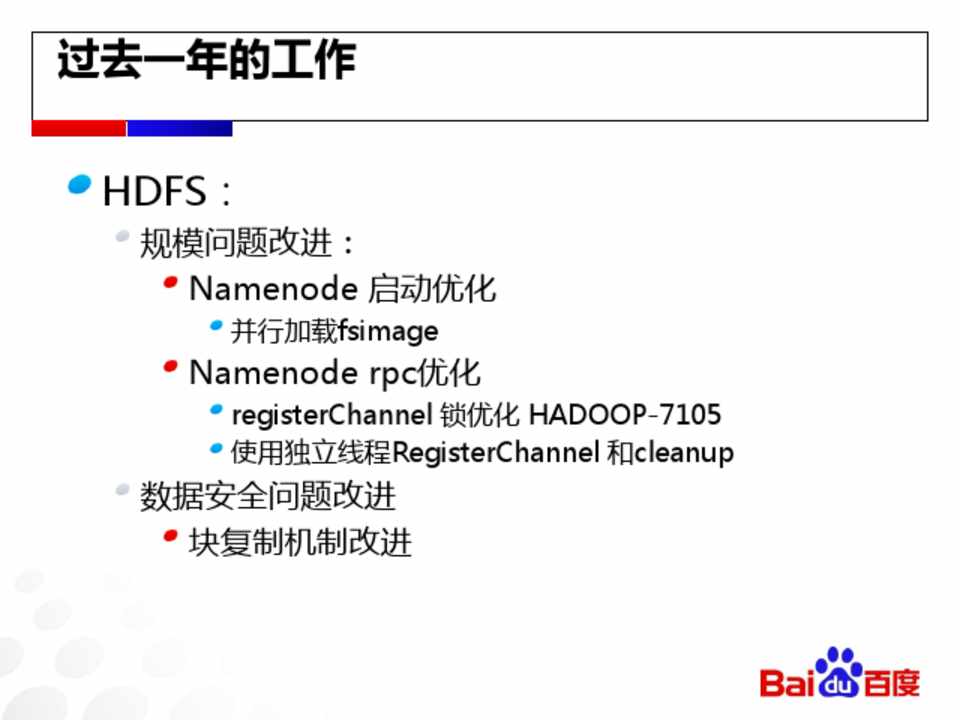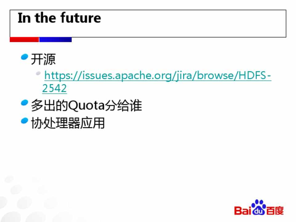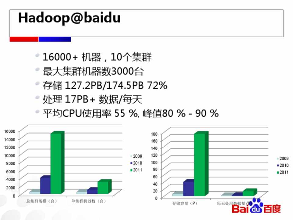 16000+ 机器,10个集群 最大集群机器数3000台 存储 127.2PB/174.5PB 72% 处理 17PB+ 数据/每天 平均CPU使用率 55 %, 峰值80 % - 90 %