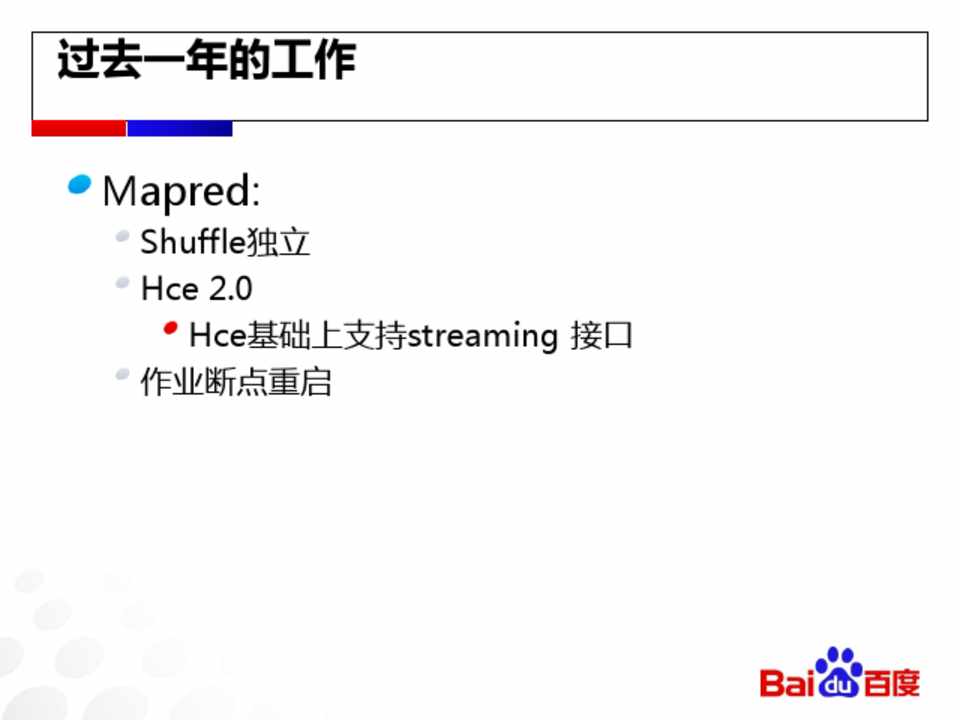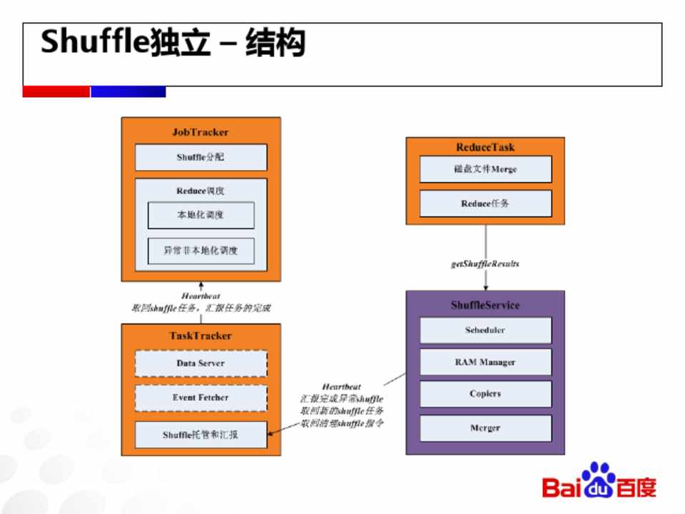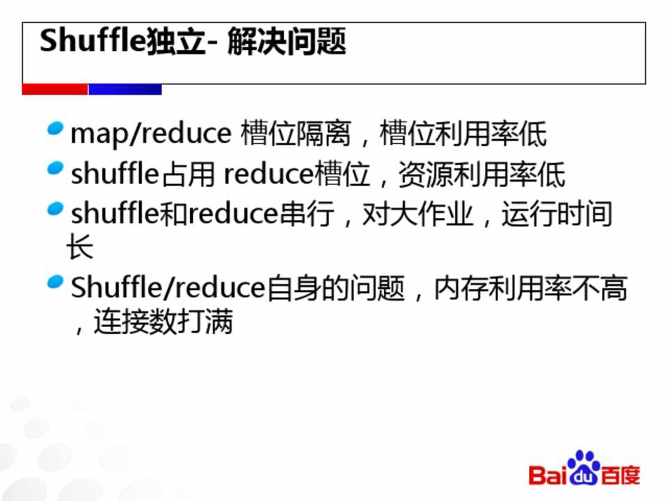 map/reduce 槽位隔离,槽位利用率低 shuffle占用 reduce槽位,资源利用率低 shuffle和reduce串行,对大作业,运行时间 长 Shuffle/reduce自身的问题,内存利用率不高 ,连接数打满
