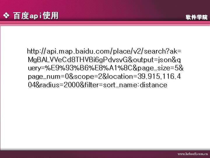 http://api.map.baidu.com/place/v2/search?ak=MgBALVVeCd8THVBi6gPdvsvG&output=json&query=%E9%93%B6%E8%A1%8C&page_size=5&page_num=0&scope=2&location=39.915,116.404&radius=2000&filter=sort_name:distance