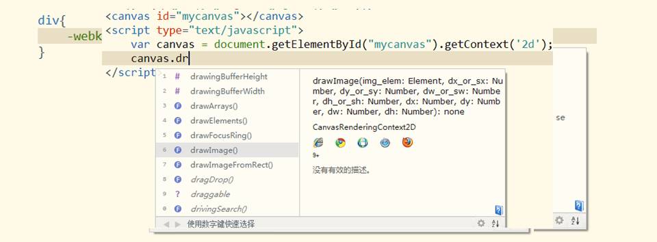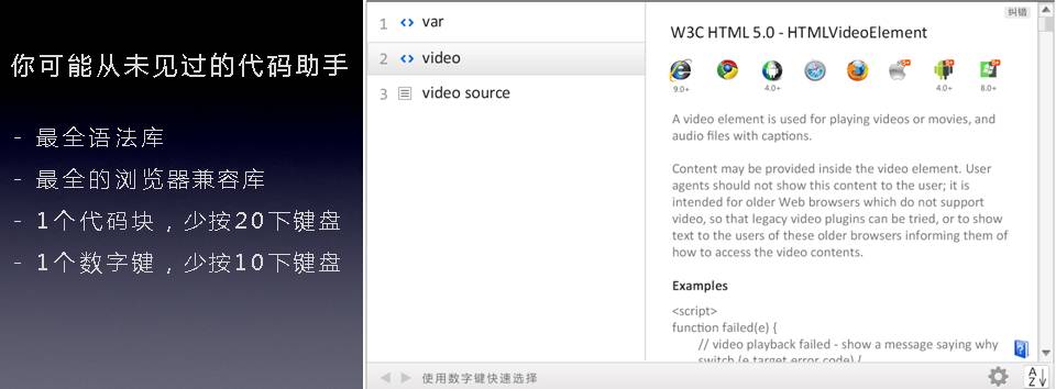 来看一下他的代码提示助手,语法齐全,还能在右边提示每个语法的浏览器兼容数据。