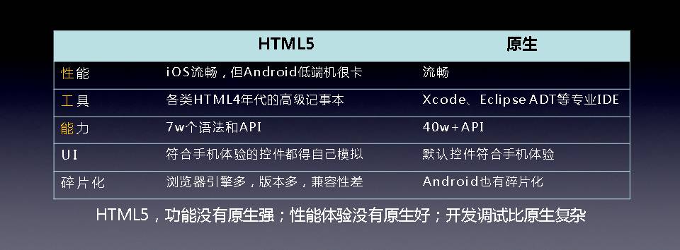 我再补2个问题,HTML5没有高性能的ui框架,碎片化问题也很烦人。