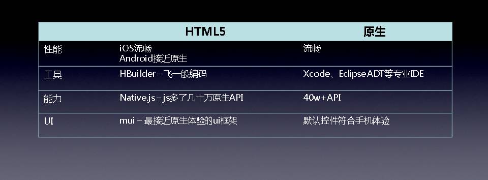 HTML5,功能没有原生强;性能体验没有原生好;开发调试比原生复杂