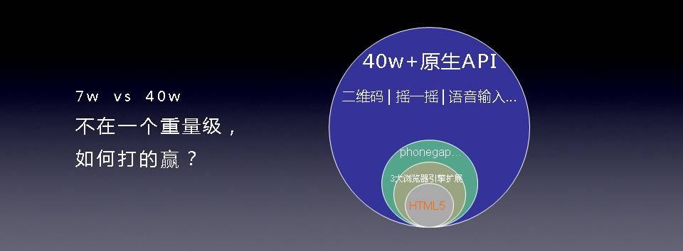 HTML5标准加上3大浏览引擎的扩展,一共是7w个api,而原生,不管是ios还是Android,每个都有40w以上api。