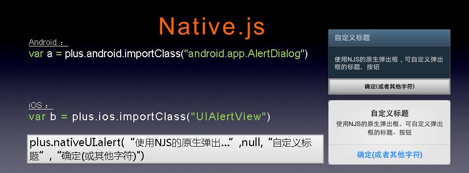 plus.nativeUI.alert(“使用NJS的原生弹出…”,null,“自定义标题”,“确定(或其他字符)")