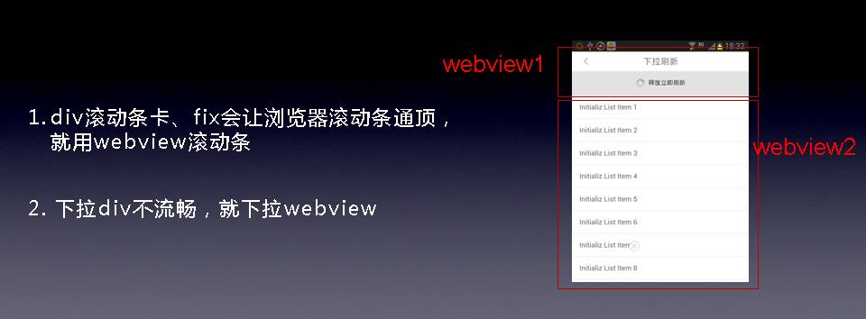 上面一个webview,下面一个webview,拉动webview向下,回弹,一切操作都不会触发浏览器里面的dom变化,弹动非常流畅。