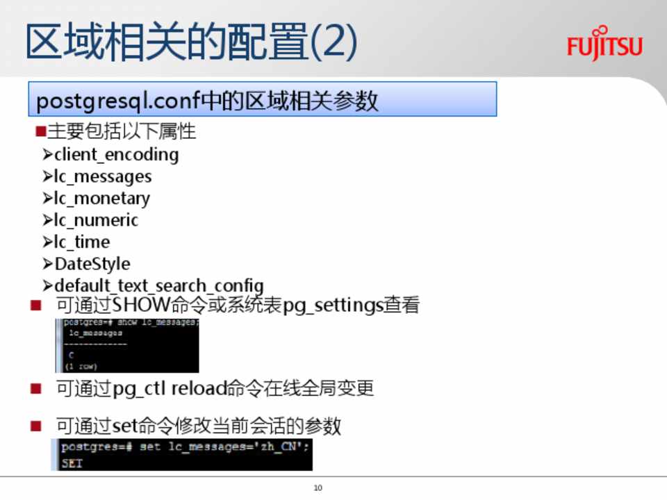 根据区域设置的参数: lc_messages lc_monetary lc_numeric lc_time datestyle(lc-time) default_text_search_config(lc-ctype)