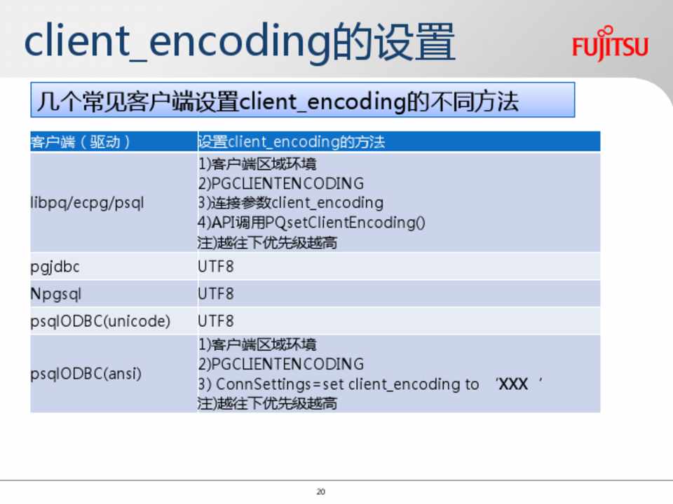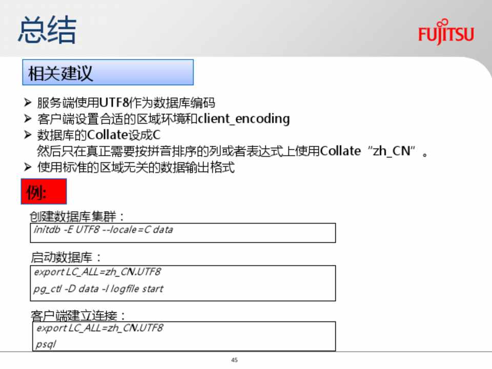 服务端使用UTF8作为数据库编码 客户端设置合适的区域环境和client_encoding 数据库的Collate设成C