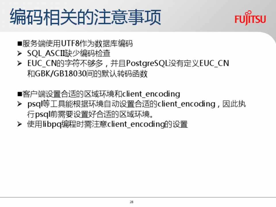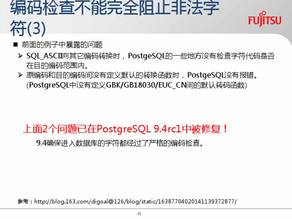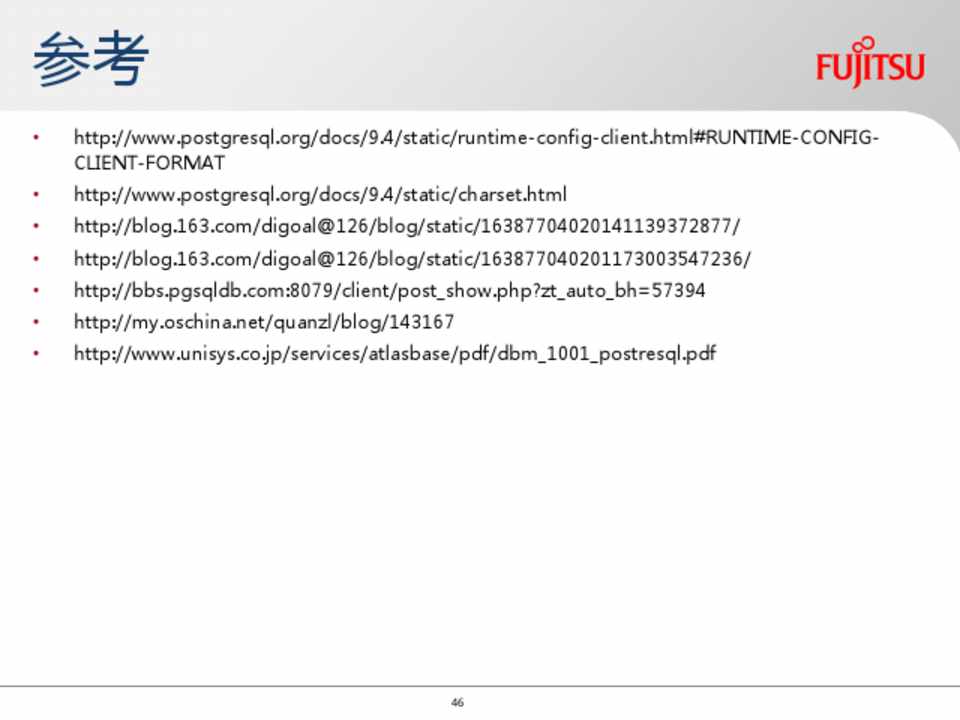 • http://www.postgresql.org/docs/9.4/static/charset.html • http://blog.163.com/digoal@126/blog/static/16387704020141139372877/ • http://blog.163.com/digoal@126/blog/static/163877040201173003547236/ • http://bbs.pgsqldb.com:8079/client/post_show.php?zt_auto_bh=57394 • http://my.oschina.net/quanzl/blog/143167 • http://www.unisys.co.jp/services/atlasbase/pdf/dbm_1001_postresql.pdf