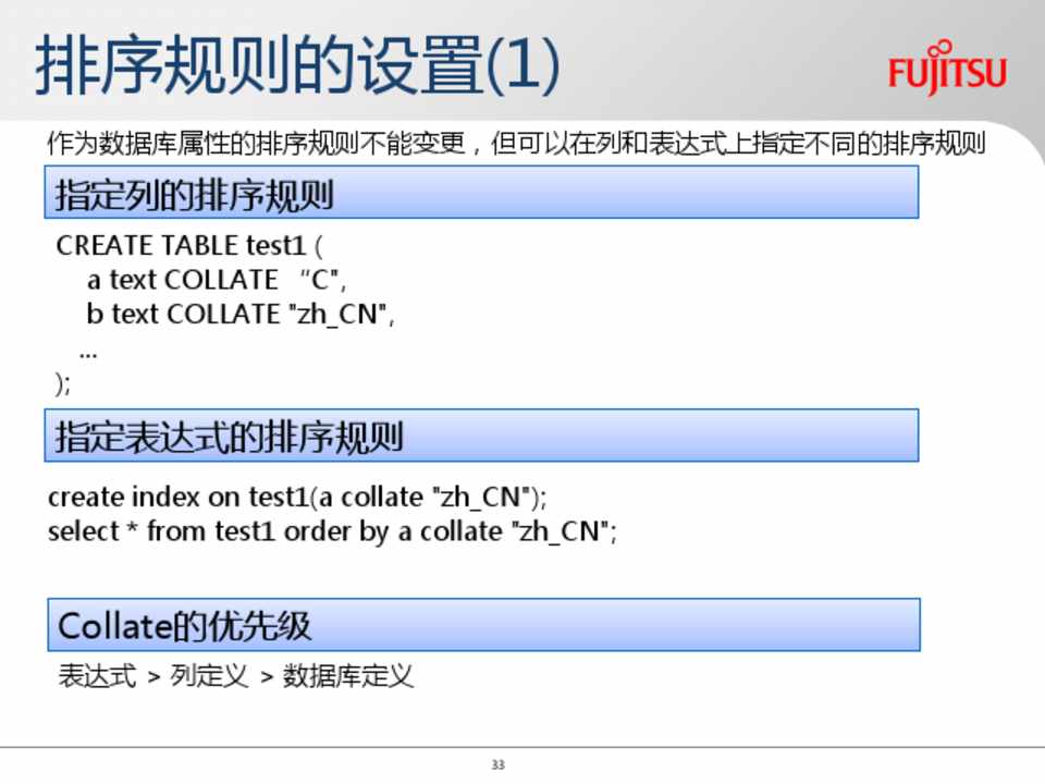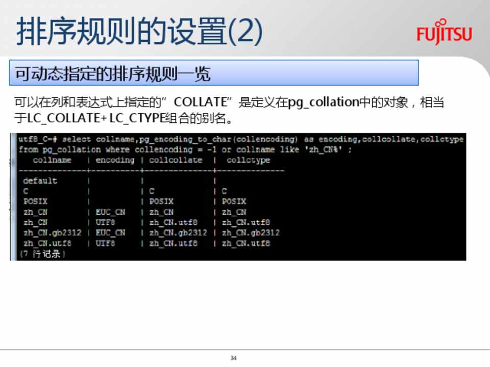可以在列和表达式上指定的”COLLATE”是定义在pg_collation中的对象,相当 于LC_COLLATE+LC_CTYPE组合的别名。