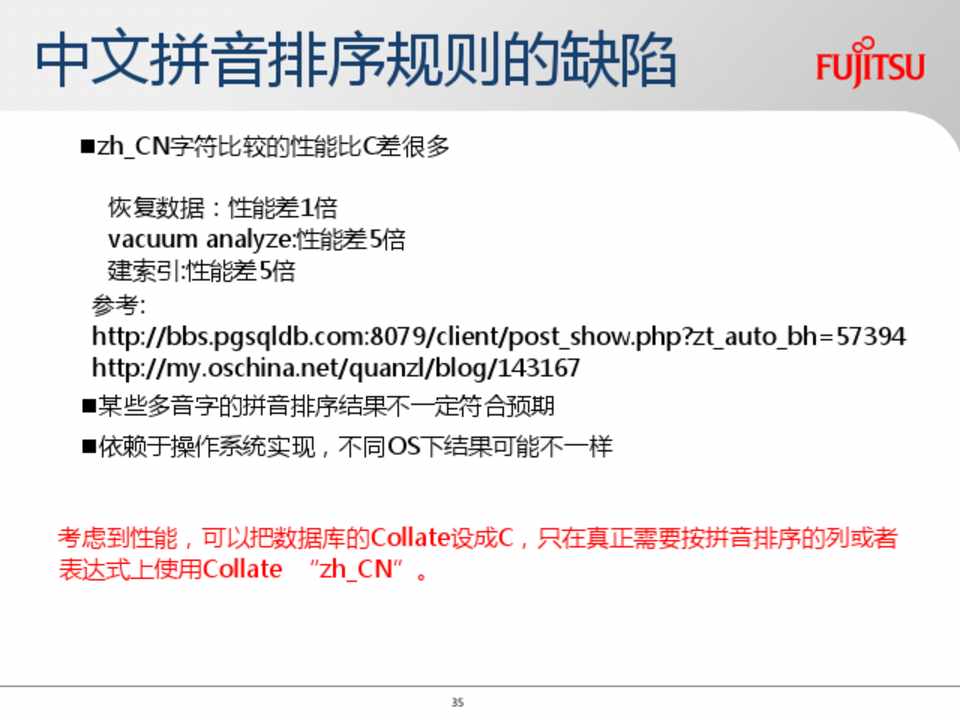 考虑到性能,可以把数据库的Collate设成C,只在真正需要按拼音排序的列或者 表达式上使用Collate “zh_CN”。