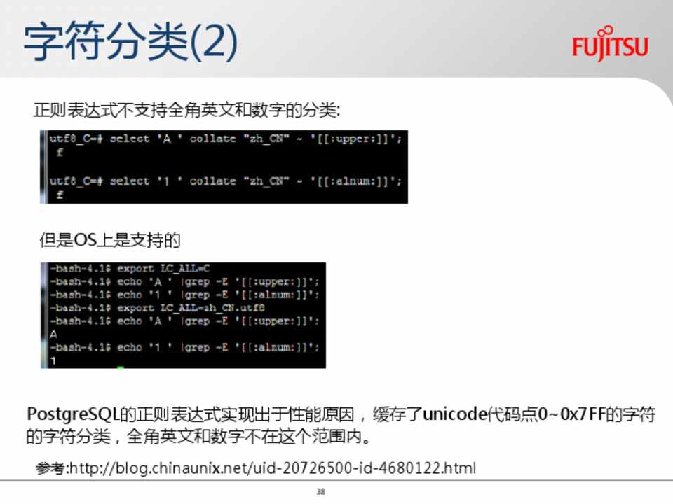 PostgreSQL的正则表达式实现出于性能原因,缓存了unicode代码点0~0x7FF的字符 的字符分类,全角英文和数字不在这个范围内。