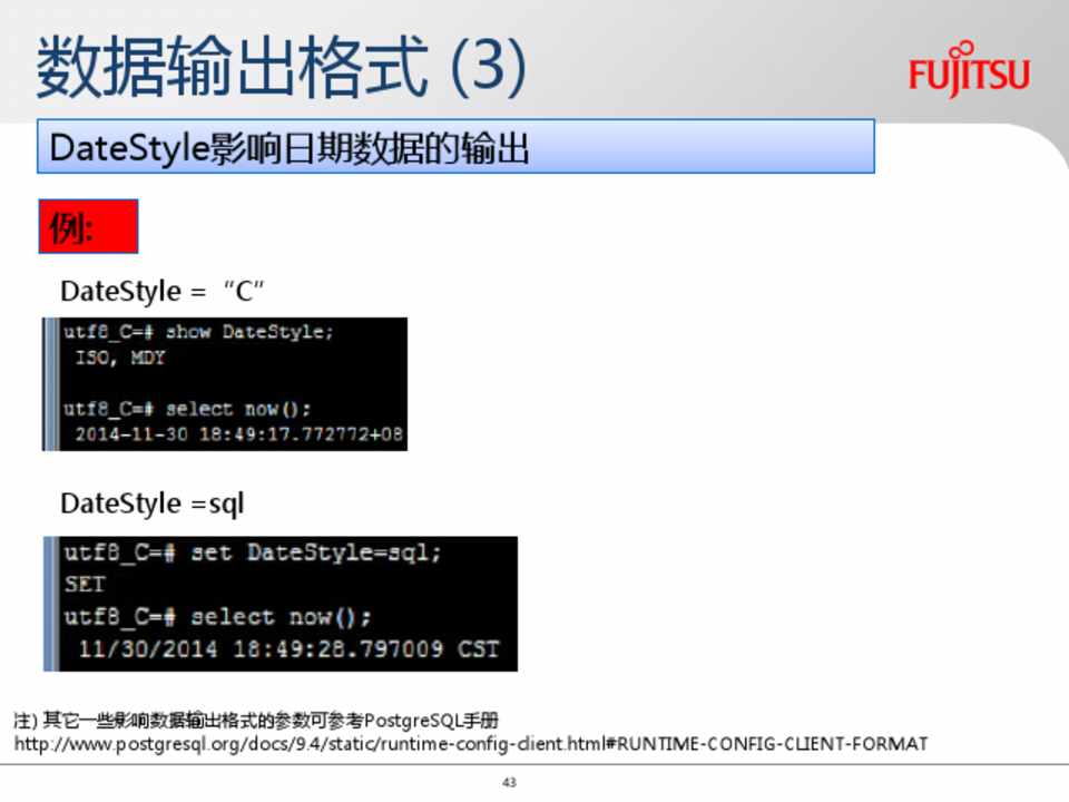 注) 其它一些影响数据输出格式的参数可参考PostgreSQL手册 http://www.postgresql.org/docs/9.4/static/runtime-config-client.html#RUNTIME-CONFIG-CLIENT-FORMAT