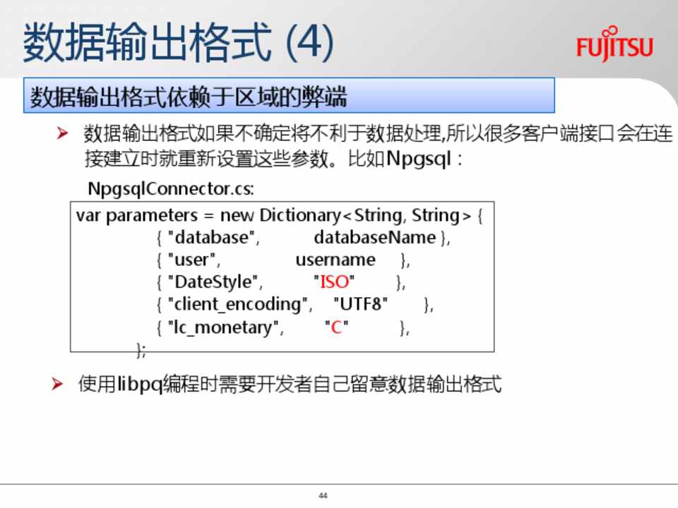 数据输出格式如果不确定将不利于数据处理,所以很多客户端接口会在连 接建立时就重新设置这些参数。比如Npgsql: