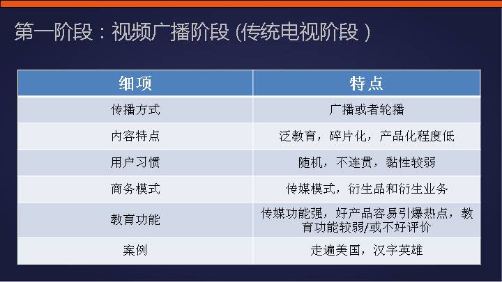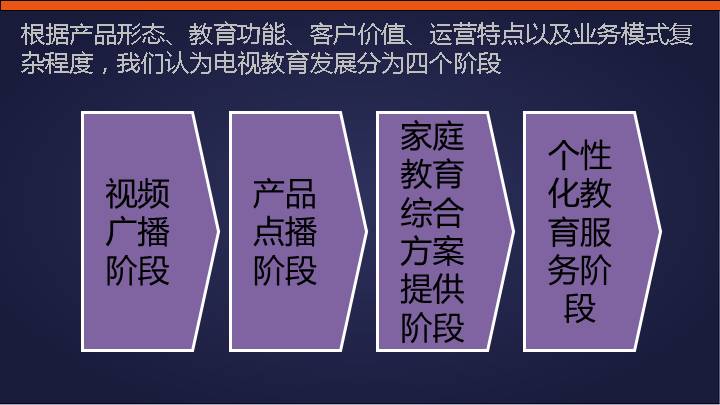 根据产品形态、教育功能、客户价值、运营特点以及业务模式复杂程度,我们认为电视教育发展分为四个阶段