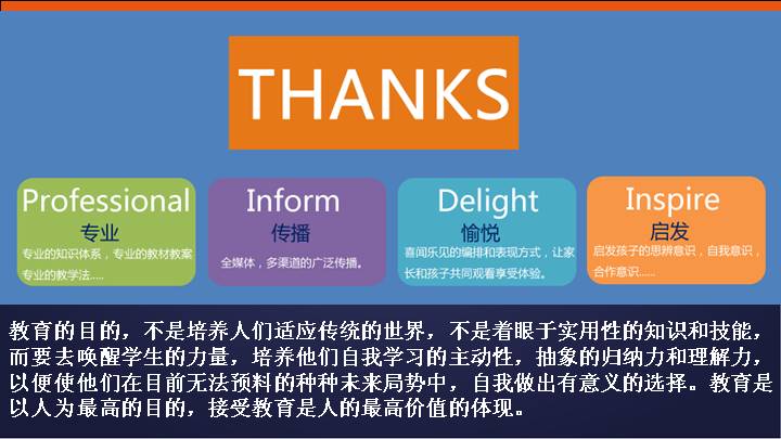 教育的目的,不是培养人们适应传统的世界,不是着眼于实用性的知识和技能,而要去唤醒学生的力量,培养他们自我学习的主动性,抽象的归纳力和理解力,以便使他们在目前无法预料的种种未来局势中,自我做出有意义的选择。教育是以人为最高的目的,接受教育是人的最高价值的体现。
