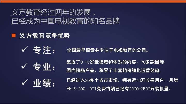 已经进入20多个省市市场,拥有近40万收费用户,月增长15-20%,OTT免费终端已经有2000-2500万装机量。