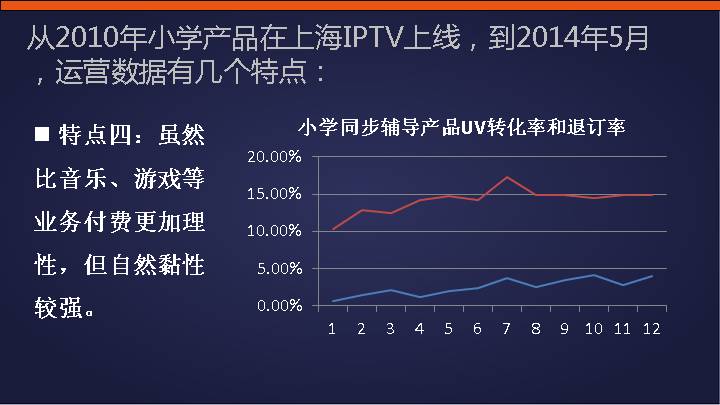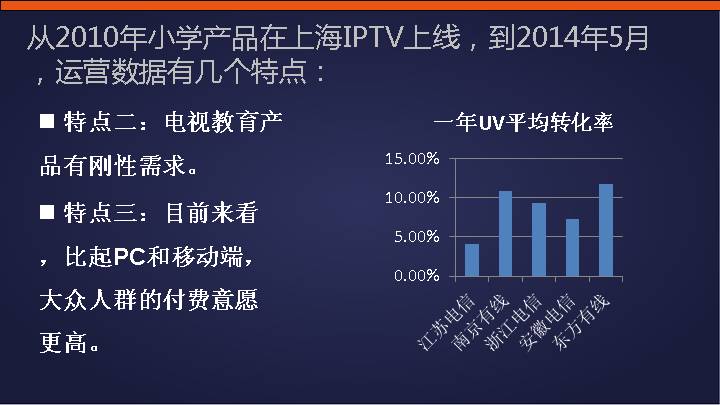 从2010年小学产品在上海IPTV上线,到2014年5月,运营数据有几个特点: