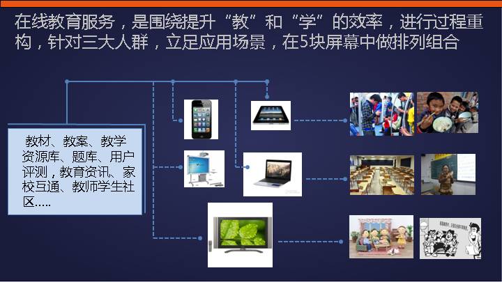 在线教育服务,是围绕提升“教”和“学”的效率,进行过程重构,针对三大人群,立足应用场景,在5块屏幕中做排列组合