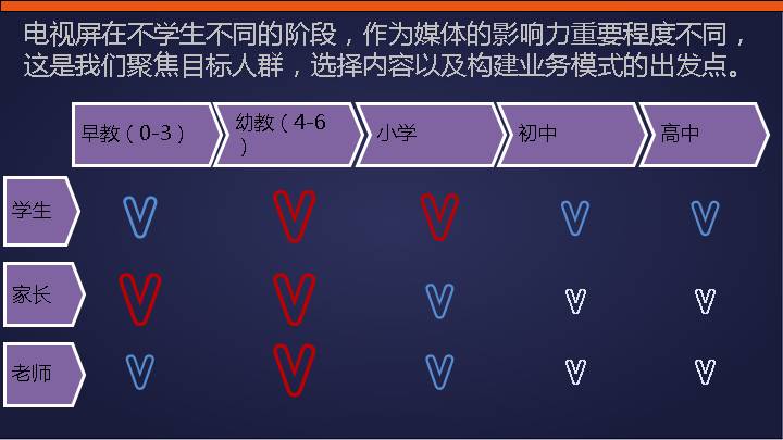 电视屏在不学生不同的阶段,作为媒体的影响力重要程度不同,这是我们聚焦目标人群,选择内容以及构建业务模式的出发点。