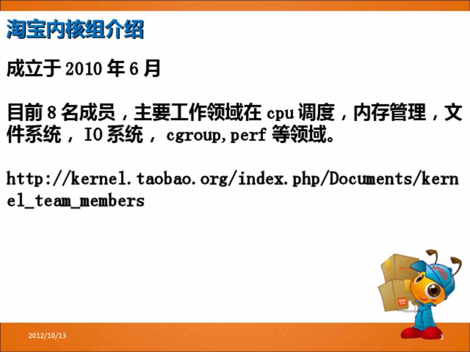 目前 8 名成员,主要工作领域在 cpu 调度,内存管理,文 件系统, IO 系统, cgroup,perf 等领域。