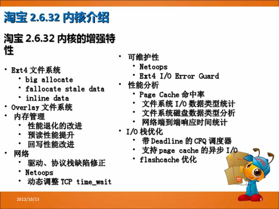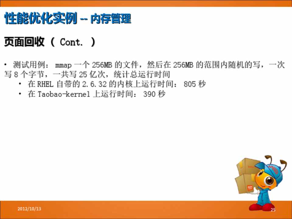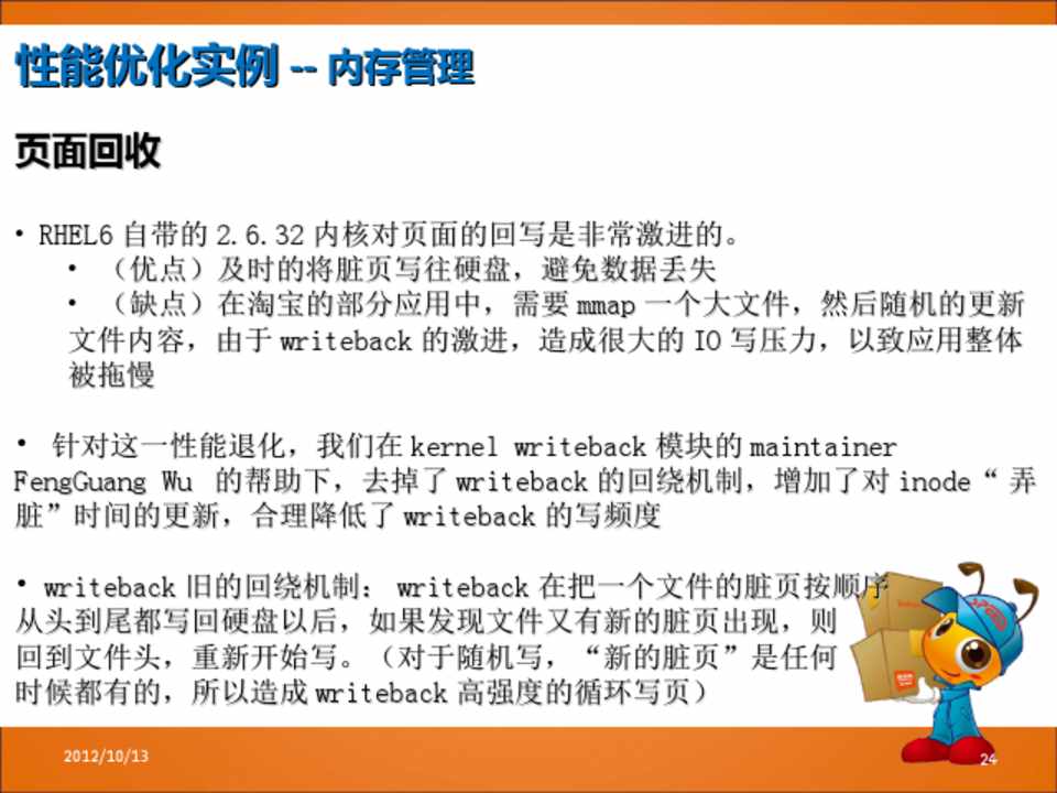 • RHEL6 自带的 2.6.32 内核对页面的回写是非常激进的。 • (优点)及时的将脏页写往硬盘,避免数据丢失 • (缺点)在淘宝的部分应用中,需要 mmap 一个大文件,然后随机的更新