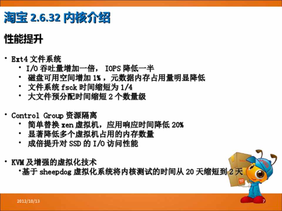 • RPS/RFS • KVM 虚拟化技术 • 增强的硬件虚拟化技术 • 大内存页面 • 虚拟机间内存页面共享 • 更高精度的时钟源和计时器 • 更全面的 Ext4 文件系统 • XFS 商业支持