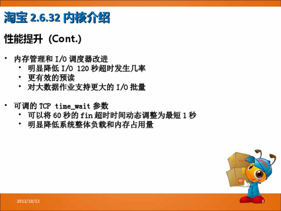 • 在 RHEL 自带的 2.6.32 的内核上运行时间: 805 秒 • 在 Taobao-kernel 上运行时间: 390 秒
