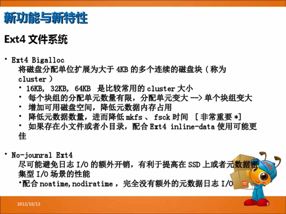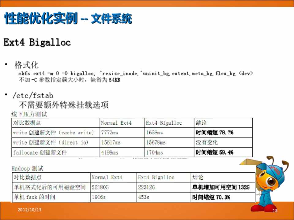 • Ext4 文件系统 • I/O 吞吐量增加一倍, IOPS 降低一半 • 磁盘可用空间增加 1% ,元数据内存占用量明显降低 • 文件系统 fsck 时间缩短为 1/4 • 大文件预分配时间缩短 2 个数量级