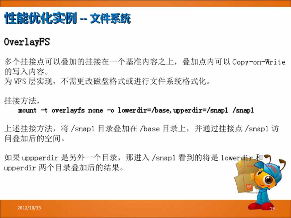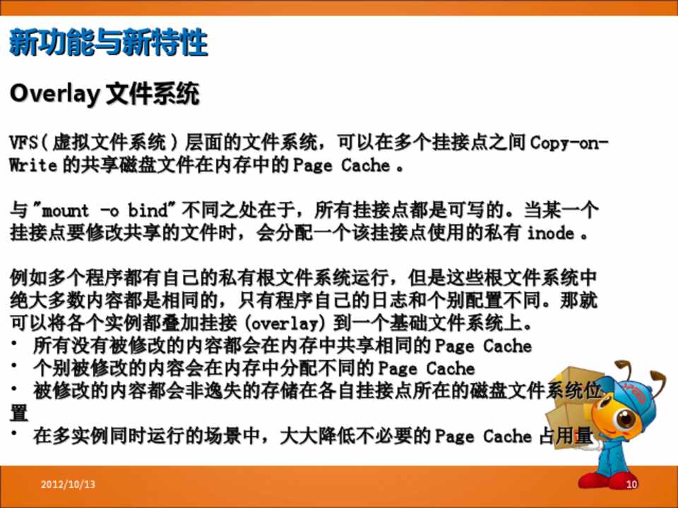 例如多个程序都有自己的私有根文件系统运行,但是这些根文件系统中 绝大多数内容都是相同的,只有程序自己的日志和个别配置不同。那就 可以将各个实例都叠加挂接 (overlay) 到一个基础文件系统上。 • 所有没有被修改的内容都会在内存中共享相同的 Page Cache • 个别被修改的内容会在内存中分配不同的 Page Cache • 被修改的内容都会非逸失的存储在各自挂接点所在的磁盘文件系统位 置 • 在多实例同时运行的场景中,大大降低不必要的 Page Cache 占用量