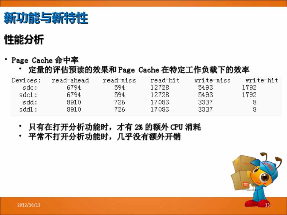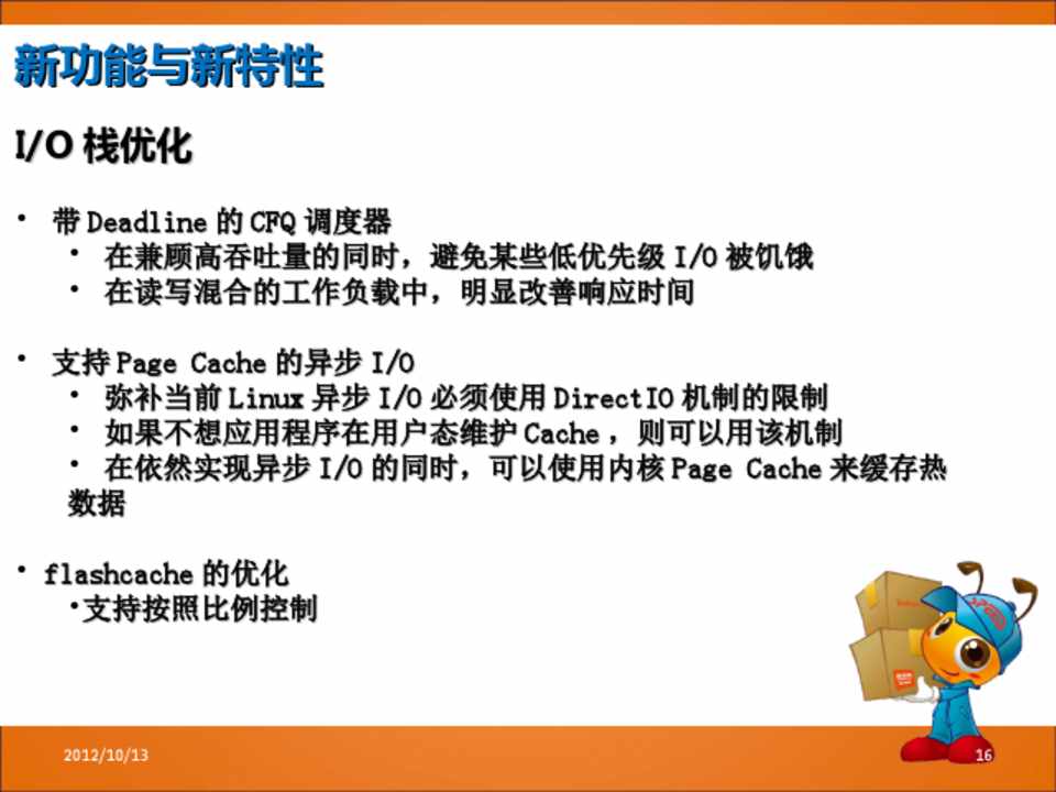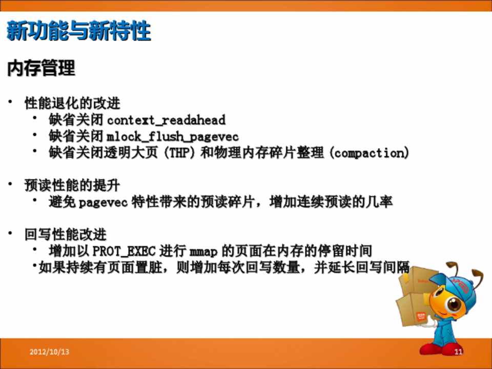 • 性能退化的改进 • 预读性能提升 • 回写性能改进 • 网络 • 驱动、协议栈缺陷修正