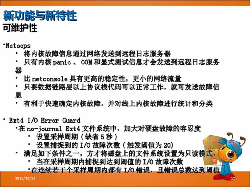 • Ext4 I/O Error Guard •在 no-journal Ext4 文件系统中,加大对硬盘故障的容忍度 • 设置采样周期 ( 缺省 5 秒 ) • 设置捕捉到的 I/O 故障次数 ( 触发阈值为 20) • 满足如下条件之一,方才将磁盘上的文件系统设置为只读模式, • 当在采样周期内捕捉到达到阈值的 I/O 故障次数 •在连续若干个采样周期内都有 I/O 错误,且错误总数达到阈值