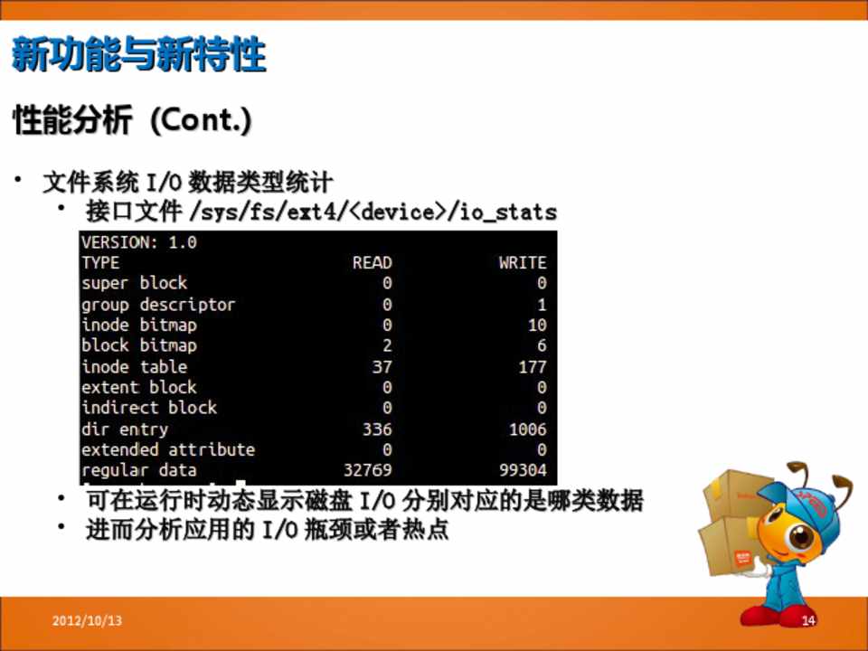 • 文件系统 I/O 数据类型统计 • 接口文件 /sys/fs/ext4/<device>/io_stats