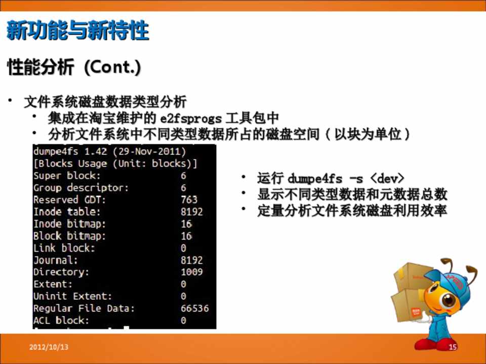 • 文件系统磁盘数据类型分析 • 集成在淘宝维护的 e2fsprogs 工具包中 • 分析文件系统中不同类型数据所占的磁盘空间 ( 以块为单位 )