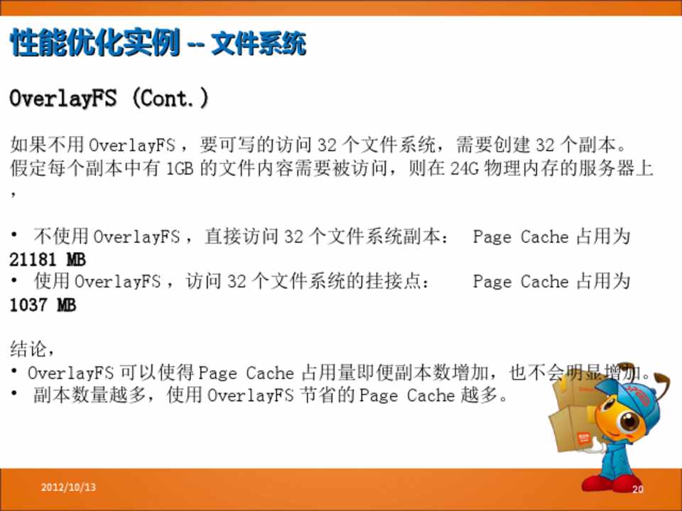 • 不使用 OverlayFS ,直接访问 32 个文件系统副本: Page Cache 占用为 21181 MB • 使用 OverlayFS ,访问 32 个文件系统的挂接点: Page Cache 占用为 1037 MB