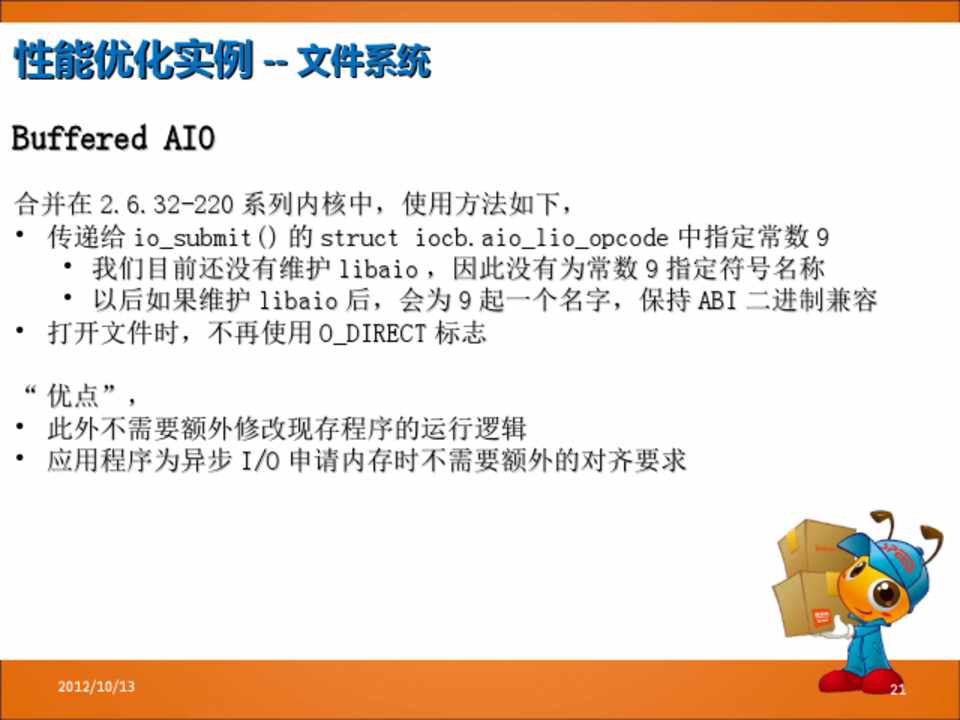 • 我们目前还没有维护 libaio ,因此没有为常数 9 指定符号名称 • 以后如果维护 libaio 后,会为 9 起一个名字,保持 ABI 二进制兼容 • 打开文件时,不再使用 O_DIRECT 标志