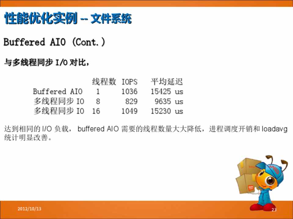 达到相同的 I/O 负载, buffered AIO 需要的线程数量大大降低,进程调度开销和 loadavg 统计明显改善。