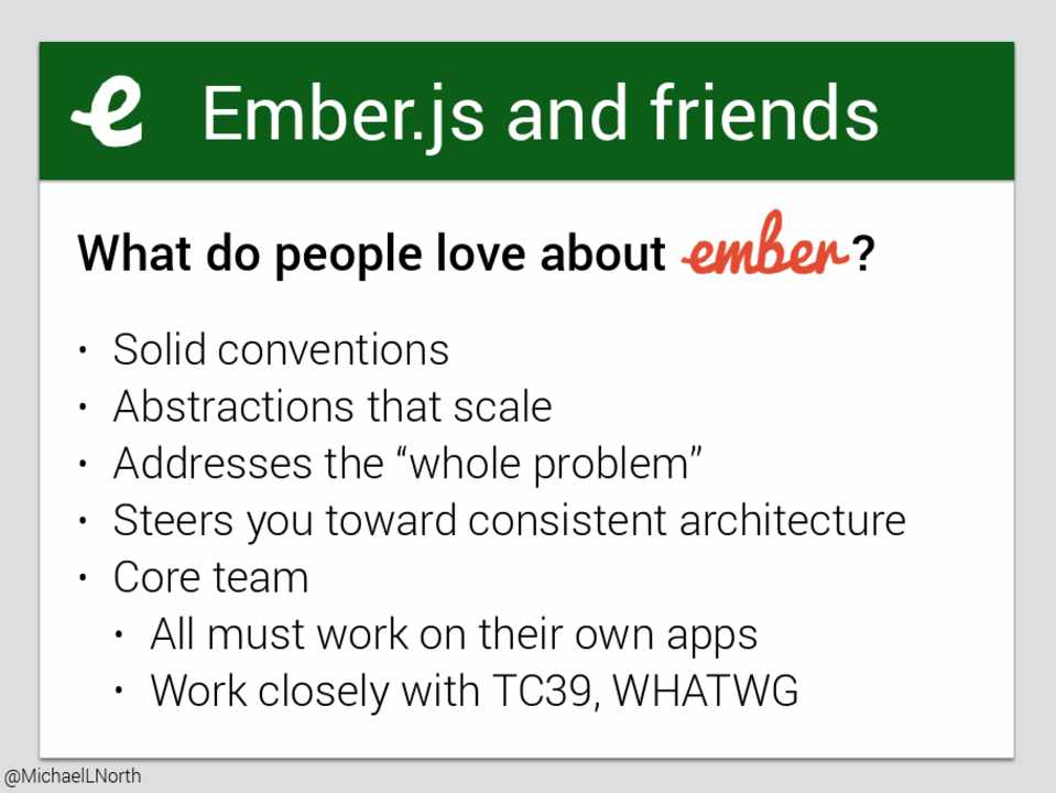 • Solid conventions • Abstractions that scale • Addresses the “whole problem” • Steers you toward consistent architecture • Core team